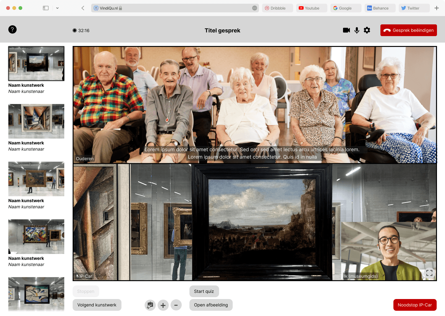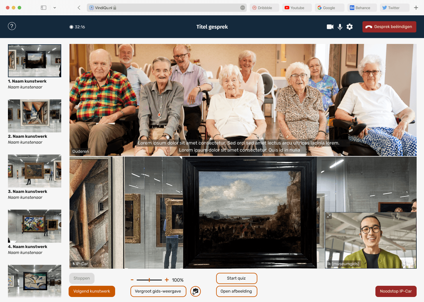 De digitale rondleidingen zullen in de toekomst door de museumgids worden begeleid. De museumgids heeft hierbij de controle over de IP-Car en besluit wanneer deze naar het volgende kunstwerk zal rijden. Daarnaast zal de gids de vergadering met de ouderen opstarten. Mijn opdracht was om de interface te ontwerpen die de museumgidsen zullen gebruiken voor de controle over de IP-Car en het geven van de digitale rondleidingen. De gids zal deze interface vanuit huis gebruiken en bevindt zich niet bij de IP-Car.